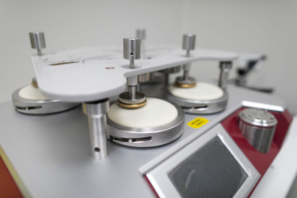 We have a modern laboratory to guarantee the quality of the end product. Some of the equipment we handle in quality control are the Data Color spectrophotometer, an instrument used for the observation and evaluation of color through numerical values, the Martindale test, which measures the pilling and abrasion resistance of our fabrics, the Dinema by Lonati stretching machine, that controls the uniformity of sizes and the light booth to evaluate and guarantee the same color of the product under different lighting conditions.